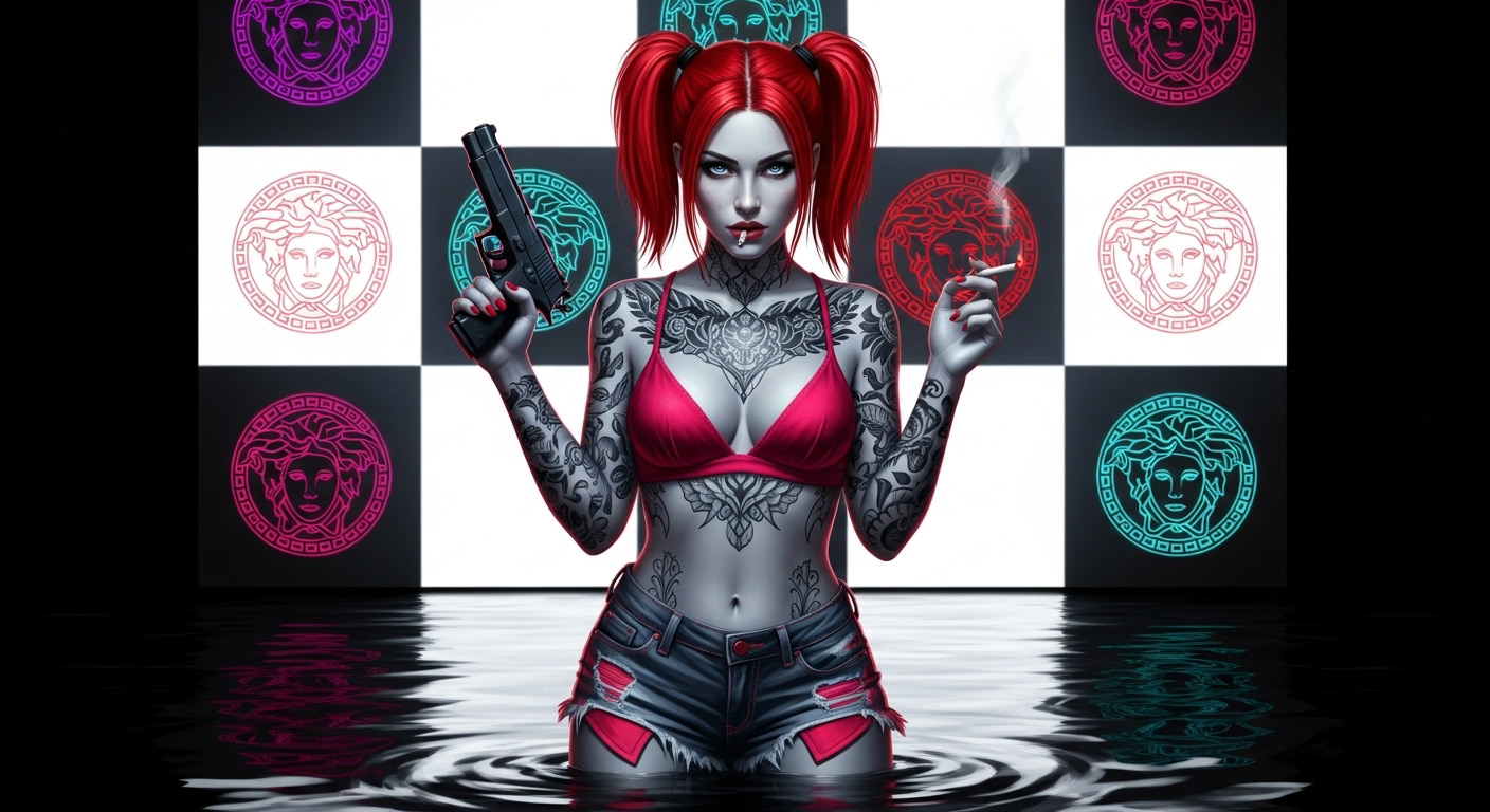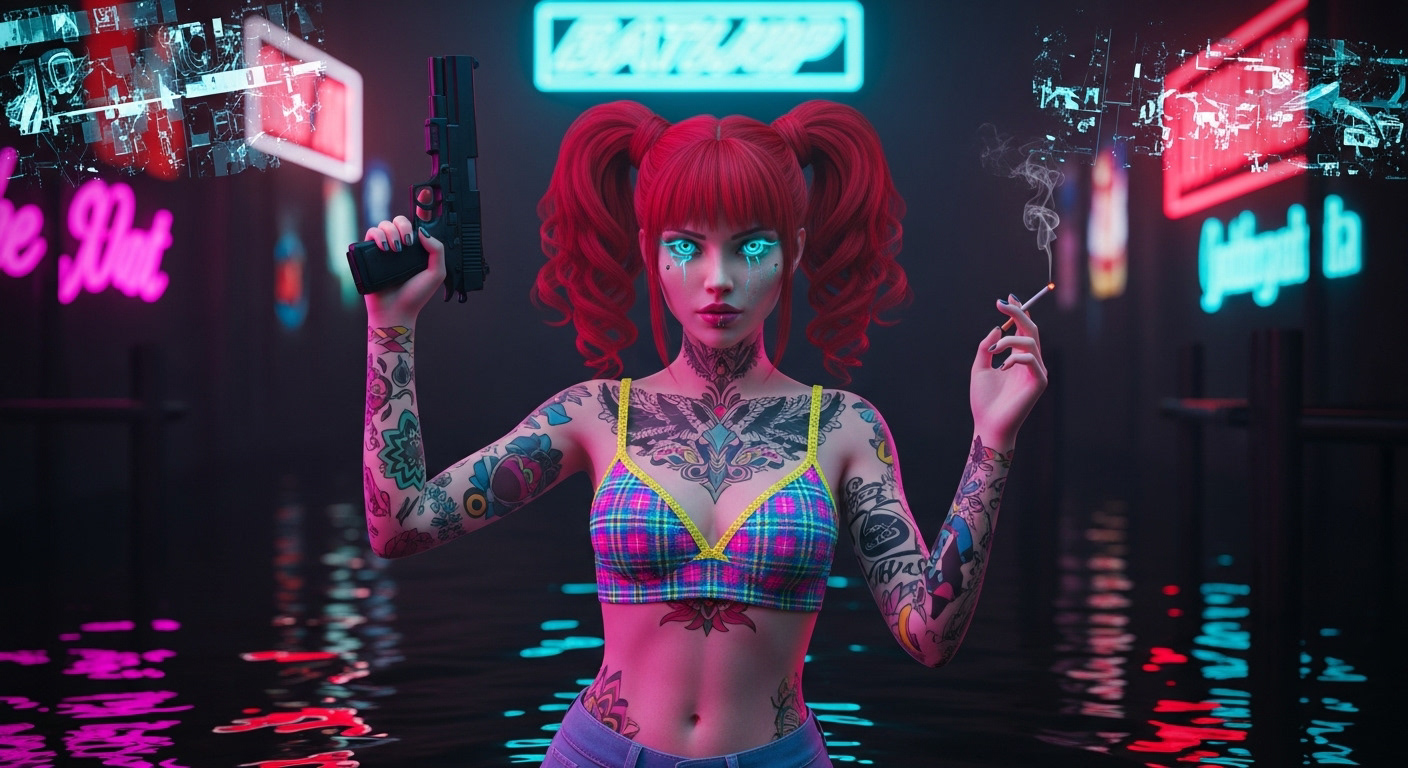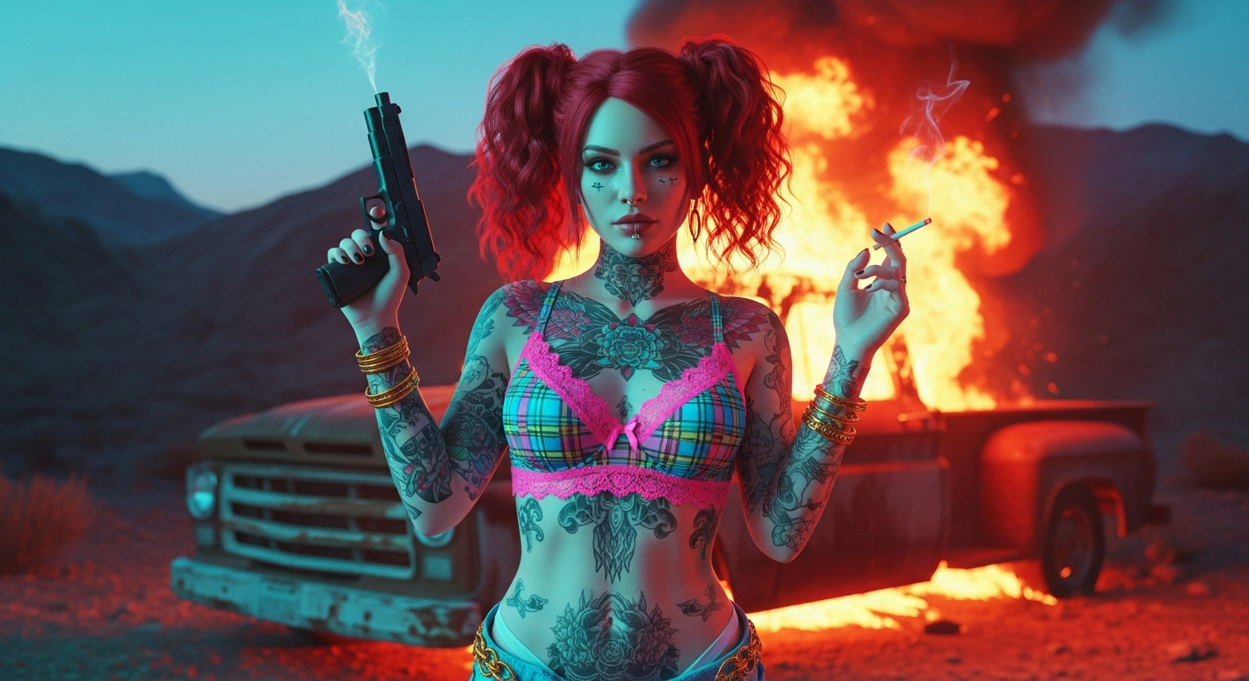 Tattoos and pig tails, with a cigarette smoking from her lips and a smoking gun in her hand.