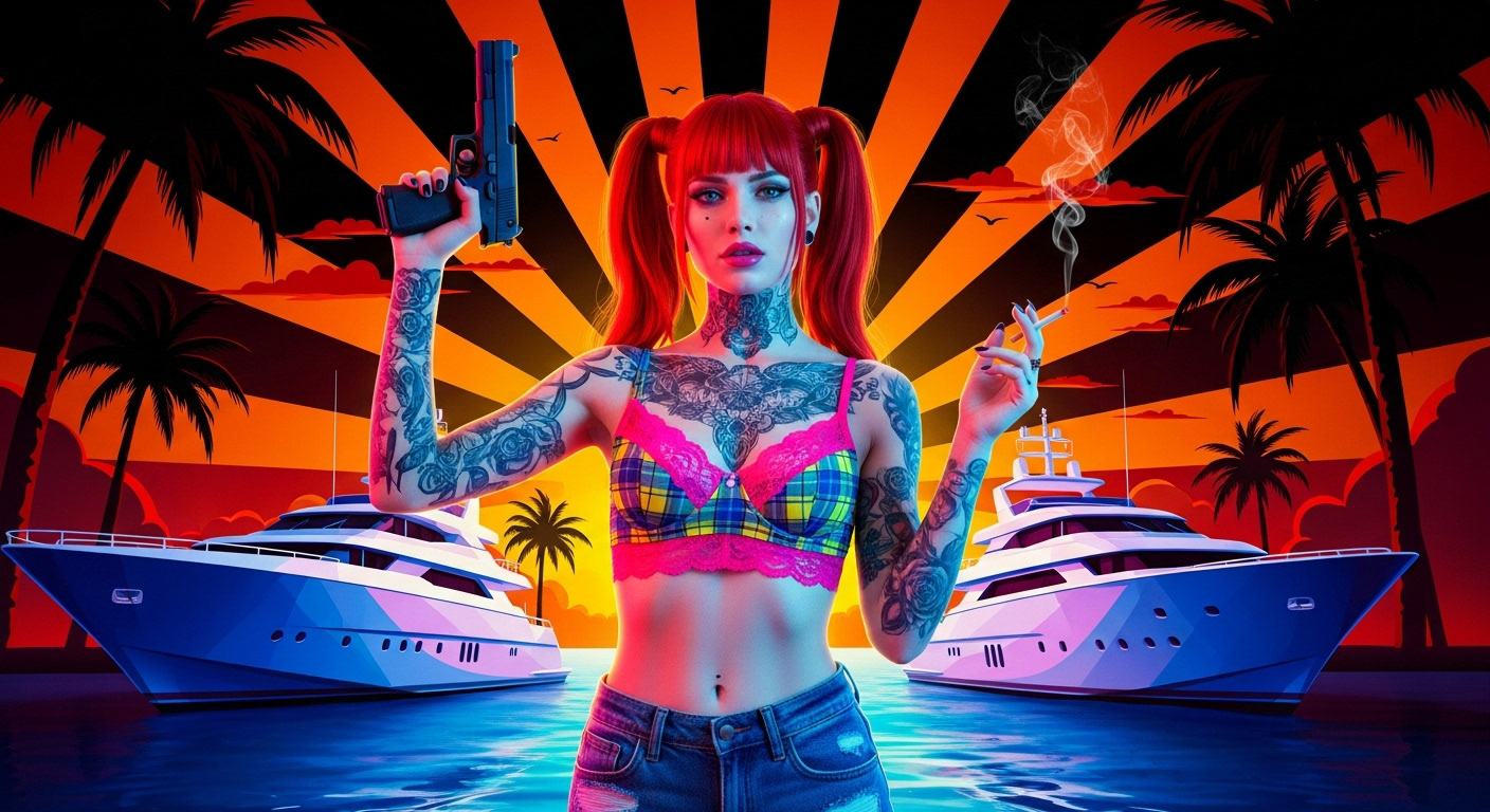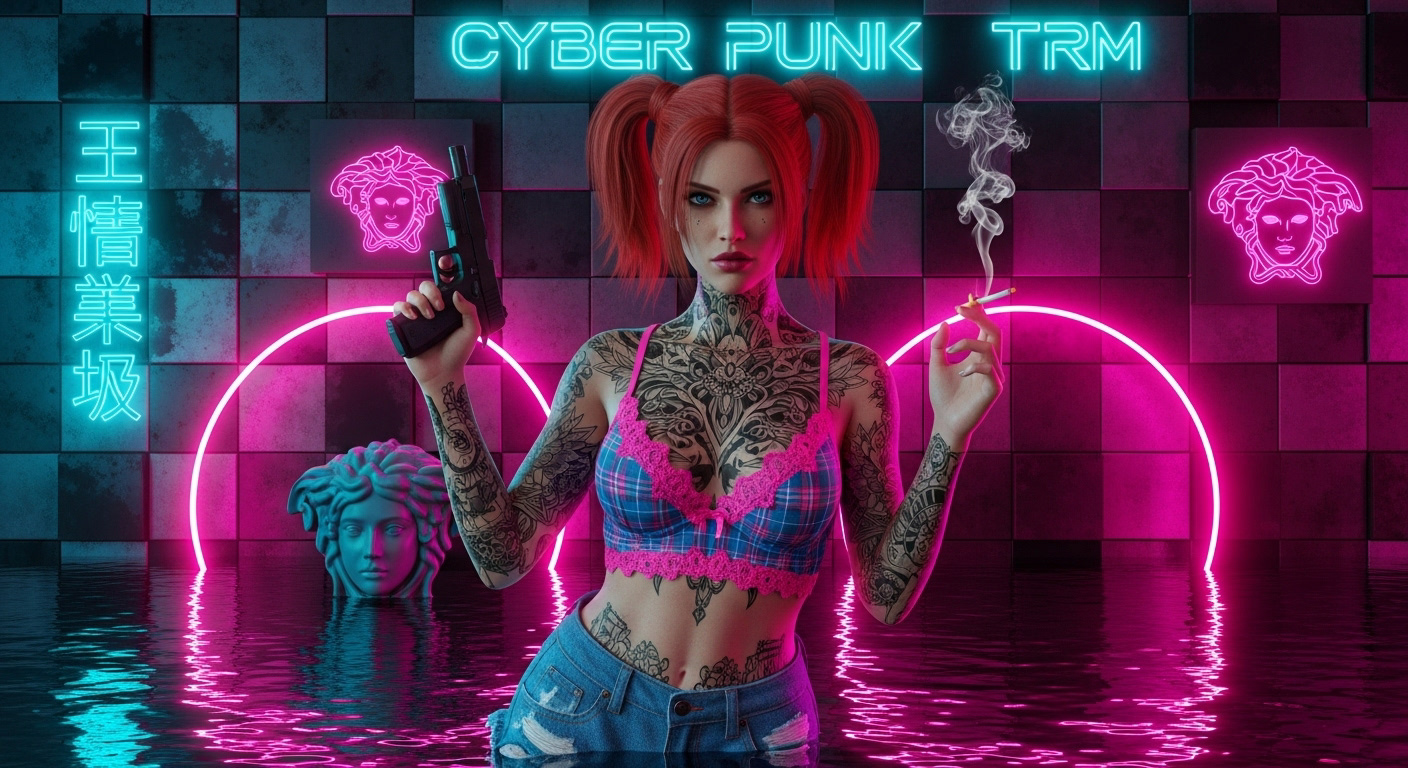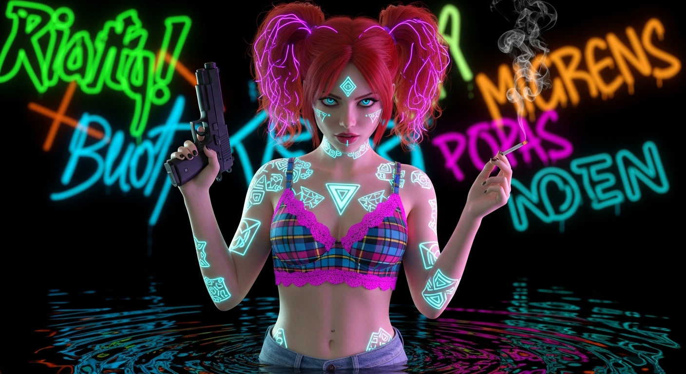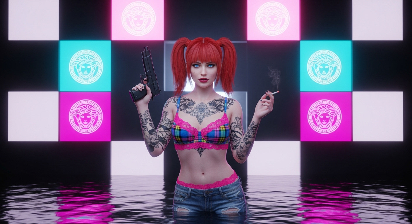 Tattoos and pig tails, with a cigarette smoking from her lips and a smoking gun in her hand.